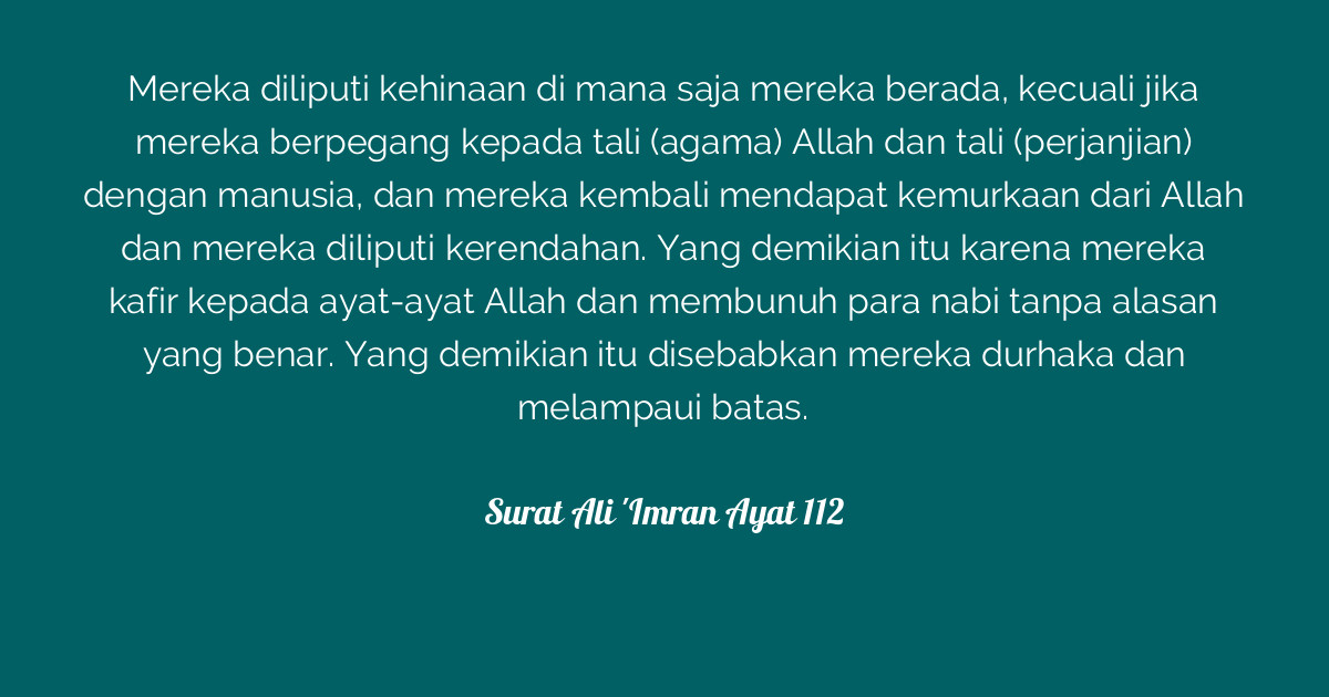 Mereka diliputi kehinaan di mana saja mereka berada kecuali jika mereka berpegang kepada tali agama Allah dan tali perjanjian dengan manusia dan mereka kembali mendapat kemurkaan dari Allah dan mereka diliputi kerendahan. Akan ditimpa kehinaan ke atas mereka itu di mana saja mereka berada melainkan yang menghubungkan diri dengan ALLAH dan menghubungkan diri dengan sesama manusia Al Imran. Yang demikian itu karena mereka kafir kepada ayat-ayat Allah dan membunuh para nabi tanpa alasan yang benar.